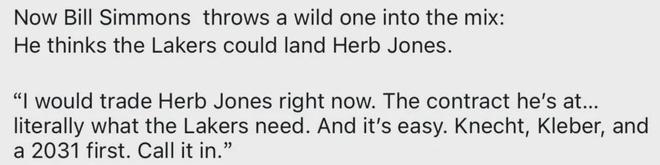 “如果我是湖人管理层,我会想交易得到赫伯·琼斯。”